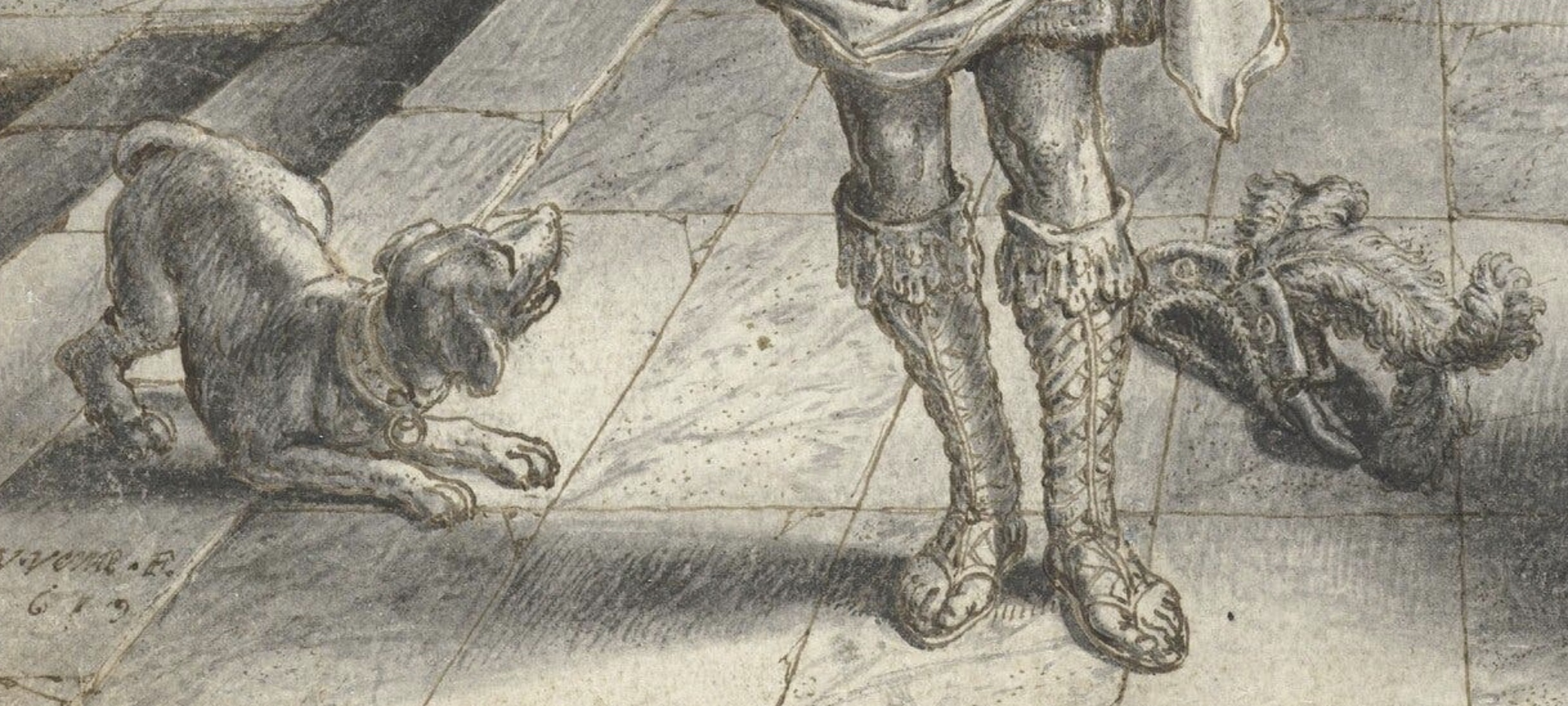 The TL;DR is that Rembrandt’s painted dog is pretty clearly adapted from the one seen in this drawing by Dutch painter/poet Adriaen van de Venne, which was more widely distributed when it was turned into an book frontispiece engraving by printmaker François Schillemans.